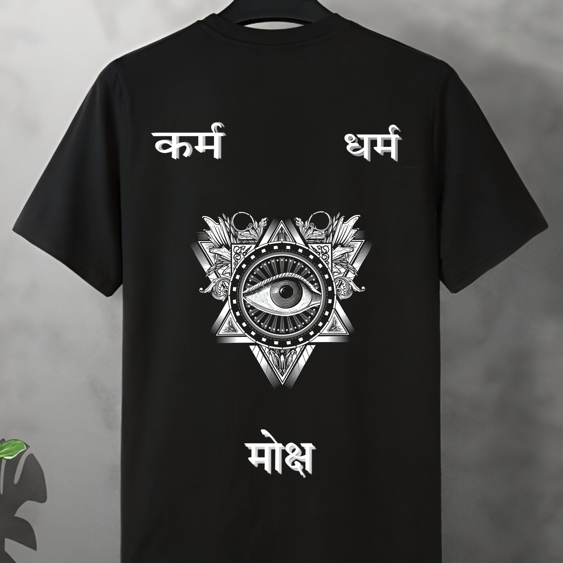 From Karma to Dharma to Moksha, the art speaks of action, purpose, and ultimate liberation. The back reminds you: truth is within, not just worn.